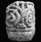 Along the lower edge is a broad, plain frame of convex section, above which is a second, narrower, plain relief frame. Above this the shaft is decorated with a bush scroll. The stem stands on a stepped base and is median-incised; only a single pair of scrolled branches survive, each is median-incised and leafless. The end of each scroll is turned up to form a diagonal which interlaces with the scroll before curving up to flank the main stem and run off the broken edge above.