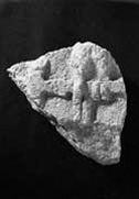 A (broad): A straight ridge running horizontally across the face is likely to be the remains of the lower frame. To the left, just above the upper arm of the cross, a curved edge may reflect the inner edge of the left-hand frame. A right hand, palm outwards, holding a horizontal cross, comes vertically down from above. The hand is in a blessing position, the second and third fingers outstretched, with the cross-shaft held between thumb and forefinger, and by the two folded fingers. The thumb would not have been visible if the hand had been shown from the other side. The cross has a long shaft, 14.5 cm surviving, and 2.8 cm wide. The cross-head has four arms expanding from a round central area, diameter 5.6 cm, in which the central setting-out point still survives. Only the lower arm of the cross survives to its whole length, projecting 5 cm from the central area and 7.3 cm from the centre-point. The arm splays from 2.8 to 4.8 cm, and is crossed by two incised lines set 0.9 cm apart and equidistant from the outer end and from the central circle.