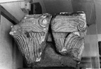 The decoration is divided into three zones of which the lower is the principal. This is of square plan above and circular plan below, each of the angles being rounded and decorated with a narrow, parallel-sided, upright leaf having a rounded, out-turned end and carved as if composed of a number of receding layers. On the vertical axis of each face is a similar shorter leaf separated from those at the angles by a pair of similar, but recessed leaves with their tips truncated. The leaves at the angles support a narrow block of square plan, in the lower corners of each face of which is a tight volute. The volutes on each face are linked by a band carved as if it were composed of several overlapping layers, which curves down in a swag to pass below a rosette on the vertical axis of the face. The upper and lower elements of the capital, linked by the leaves at the angles, are elsewhere separated by a narrow recessed zone decorated with narrow relief bands forming a zig-zag pattern. Each of the triangular fields thus created has two vertical facets.1