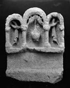A (broad): The decoration is divided into three zones. The lowest is flat, its surface level with that of the arcades and the strip on which they stand (Ills. 506&ndah;7). The height of this zone is irregular due to the chamfers on the bottom of the stone. The middle zone is a horizontal slot, 4 cm deep and 13 cm high. There is a small square scar, 4 by 4 cm, cut diagonally into the face of the slot (Ill. 508). The upper zone, 34 cm high, consists of a deeply recessed triple arcade (maximum depth c. 7 cm) which sits on a flat base, 4 cm high. The arcade is composed of two smaller arches, that on the left 23 cm high and 11 cm wide, that on the right 24 cm high and 10 cm wide. These flank a tall central arch, 27 cm high and 16 cm wide. Four columns with moulded bases and capitals carry the arches (total height of the columns 17–18 cm, the shafts 9.6–10 cm high). From the centre of the middle arch, a lamp hangs on a long cord, attached to the rim of the lamp by three strands. The lamp has a globular body and a small foot ring. Around it radiate a series of cuts into the background of the relief. Suspended from the intrados of the central arch are curtains, which swing behind the central columns and knot themselves around the back of the smaller arcades.