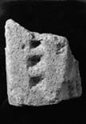 A corner element, part of a frame, with decorative strips running as raised bands along the adjacent face, one band, 8 cm, the other 9.4 cm in width. A pattern of almost square boxes, separated by narrow ridges, runs along each face, set back 2 to 2.4 cm from the dressed face. The boxes are c. 2.5 cm square and 1.2 to 1.4 cm deep, and on the wider band retain patches of thick whitewash.