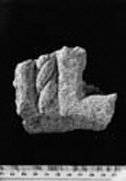 The inner element of this relief is what appears to be a bent arm. This consists of a vertical upper arm sloping slightly upwards, 6 cm of which survives, with rounded muscles, and a horizontal lower arm expanding into the palm of the hand, which is open but broken away where the fingers should start, measuring (from the point of the elbow to the broken edge) about 7 cm. A small part of the background is preserved behind the crook of the arm. To the left of the arm there is a vertical Z-twisted cable, each strand almost half-round and half the total diameter of the cable. To the left of the cable there is an uneven rounded moulding, which may be widening in its upper part, and is not unlike the raised arm. There is no sign of any continuation to the left of this, other than that of the background surface.