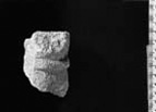 The dressed face on the left cuts across the colonnette before it has completed its curvature, so that a second stone is needed to complete it. A rounded band, 1 cm wide and about 4 cm in diameter, gathers in the colonnette horizontally. The upper and lower elements flare out from this central band. The lower has a carved bottom edge and thus completes the scheme; it is 2.3 cm high. The upper element is similar but broken away; it survives to a height of 2.6 cm. The background surface survives to the right and below the carving.
