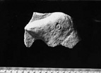 This is the head of a bird looking left, raised 10–16 mm above the background. The head has a curved outline. The beak is indicated by two lines and the eye by a pointed circle with a deep central puncture. The junction between head and neck is perhaps indicated by a groove.