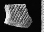 This is a typical mason's chipping, representing debris left after the carved surface had been knocked off in preparing the stone for reuse. The decoration covers the whole surface ending to the left in a blank, concave edge. At the bottom the decoration dies away into an uncarved band. The pattern is composed of bands, c. 1 cm wide, in which S-twists alternate with plain ribbons.