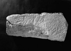 A (broad): The left-hand section has the head, hair, and the beginning of the neck, of a beast looking right. The eye is almost round, with a tear-fold at the right edge. The hair or mane is rich, at least 23 cm wide and composed of twisted strands. A projection from the forehead, set back 1 cm from the face, may be horns or a forelock. The snout, which overhangs the lower jaw, slightly overlaps the frame. The frame has a central pattern of rectangular cuts, producing a billet-like appearance, with a plain band to the right; the left edge has broken away throughout the height of the stone. To the right of the frame there is a triangular (or, more likely, oval) bunch of berries, perhaps grapes, hanging from the innermost of a spray of at least three elements.