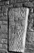 A (top): The slightly convex face is decorated with a low-relief Latin cross (type A1). The expanding lateral arms terminate on the edges of the stone. Below each lateral arm, and separated from it by an incised line, is a broad, plain, low-relief border. Its inner end terminates on the lower limb of the cross and is separated from it by an incised line. The outer end unites with a broad, plain lateral border. Each of the fields thus defined is decorated with a four-strand plain plait. The decoration above the lateral limbs is similar except that each of the decorative fields has an inner broad, plain, low-relief border flanking the head of the cross, and separated from it by an incised line. The interlace in the upper fields is median-incised.