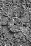 On a sub-rectangular panel is a circular dial in relief, its frame delimited by an incised line paralleling its edge. In the centre is a drilled gnomon hole. The lower part of the dial is calibrated; the lines of calibration are incised. There is a pair of horizontals, a vertical, and a line mid-way between each horizontal and the vertical. The vertical and the lines to the right are crossed close to their ends, the ends of the cross-bar and principal lines being drilled. To the left, only the horizontal with its drilled end, and the inner end of the intermediate line survive. Above and below, and to each side of the dial are bulbous protrusions in relief, narrowing towards the dial. Between each pair a narrow relief stem develops from the dial and runs into the corner of the slab where it terminates in three long, narrow, convex-sided, hollowed leaves.