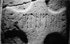 Inscription The inscription, in Anglo-Saxon runes, is set along the arms of the cross, upside-down with respect to its head. Lines are punched out, and most of the terminals bear wedge-shaped serifs. The first rune is worn and partly broken away, but enough remains for identification to be certain. The earliest published drawing suggests it may have been clear and undamaged when the stone was found ((— ) 1834, 604). The three wedge-shaped points which follow the runes are deeply cut and clearly intentional. The inscription reads: