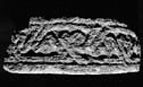 Fragment of a slightly tapering drum, dressed flat below, but roughly broken above and to each side. Along the upper and lower edges of the surviving portion of the face is a narrow, plain, raised border. Inside it is a heavily-weathered geometrical fret pattern.