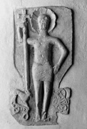 Sub-rectangular panel decorated with a half-round, full-length, frontally-placed figure. It has a dished cruciform nimbus, and wears a short featureless skirt. The legs are together, but the feet and suppedaneum are broken away. The figure's left arm is bent so that the hand is placed palm outwards, touching, but not resting on, the hip. The right arm is extended and bent upwards at the elbow. The hand is turned inwards at the wrist to hold the shaft of a long-stemmed cross. This has a splayed-armed cross-head. The lower end is thrust into the mouth of an inward-facing animal at the foot of the figure. The head of the animal is up-turned and backward looking, with an open mouth, reversed lentoid eye, and pointed ears. Its body and front legs are naturalistically treated, but the front legs rest on interlacing loops developing from the back legs. A tail with a lobed tip curls down and across the hindquarters. To the figure's left is a second inward-facing animal. This has a low relief, contoured, ribbon-like body which develops into interlacing coils. The jaws are drawn out and back. There is a reversed lentoid eye and small oval ears. The animal is in combat with a second similar, but smaller, ribbon-like animal. The panel tapers abruptly below the level of the figure's waist but widens irregularly to accommodate the two animals.