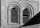 Each face of the tower has a pair of round-headed openings, each of two orders. The outer has quarter-rolls which continue downwards as jamb-shafts; the rolls meet in the middle so that the central jamb continues down as a half-round shaft. The inner order consists entirely of half-round soffit rolls continued as shafts. Between the arches and jambs are continuous strip-like capitals delimited by a narrow, plain moulding of square section below, with a wider one above. Each is decorated with foliate ornament consisting of semicircular groups of leaves, each having a series of narrow, rounded-ended, hollowed elements radiating from the point where it emerges from the lower moulding. Above the central capital, where the quarter-round rolls of the outer order join, there is a larger foliate element of this form.