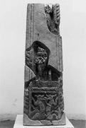 D (narrow): The border mouldings are like those on face A, and the lower third of the face is ornamented with foliate decoration. From the lower corners of the face emerge narrow, diagonal plant stems, three from the right and two from the left, interlacing where they cross and terminating in pointed, oval, berry bunches. Each stem is median-incised and between the stems to the left are two short, expanding rounded-ended, hollowed leaves. The upper two-thirds of the face are occupied by a pair of elongated robed figures, side by side, and surviving from shoulder level. Each is clad in a horizontally-ribbed undergarment, with a vertically-ribbed overgarment thrown over the shoulders and gathered up across the body. The legs are clad in a close fitting trouser-like garment, laterally ribbed, which terminates at the ankle in a pair of narrow horizontal mouldings. The out-turned feet are shod and rest just above the foliate decoration. At ankle level the face is abruptly recessed allowing the legs to be treated in high relief with a degree of undercutting. The left-hand figure holds in its right hand a key. The right-hand holds an unidentified feature.