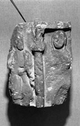 Fragment c: Dressed flat above and below, and roughly broken to each side. It is decorated with a barefoot, robed figure, in profile, cut off at chest level, and leaning to the right with its left foot flat on the ground and its right foot half raised. The figure wears a long robe terminating at mid-calf level in an undulating hem which is paralleled by an incised line. Over this is a second robe of similar length gathered across the body to the right, incised lines suggesting the folds. The figure is winged. In front of the figure is a plain rectangular block on top of which is a swirling device, possibly a flame. A hand, palm outwards, develops from the lower right in front of the block. To the left of the figure is the garment edge and part of the wing of a second figure. Between the two figures, at thigh level, is a disc-shaped object. Traces of paint survive, often applied on a thin plaster ground. Red is used for the background, blue for the robes.