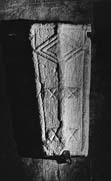 A (top): The eaves are bordered by a roll moulding which is continuous around both head and foot ends. The central ridge is also defined by a broad roll moulding; joining this are three pair of 'arms' cut in low relief, each of which is symmetrical about the ridge. The uppermost, at the head end, consists of a pair of addorsed equilateral triangles which form a lozenge-shape across the ridge. Within the lozenge two more pairs of triangles are created by concentric incised lines. Above the lozenge, again symmetrically placed to left and right, are two lightly inscribed circles based on identifiable compass holes. The two lower arms are composed of pairs of rectangular fillets also in low relief and also symmetrical about the ridge. In the centre of each fillet a pair of incised diagonal lines form an X. These fillets are very similar to the 'bull's head' motifs which belong to the mid-Kesteven covers group (Fig. 11).