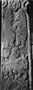 A (broad): This face carries the most complex and the only figural decoration on the shaft. (i) At the top, a pair of confronted creatures, possibly birds, truncated by the cut end of the shaft. They are characterised by short, pointed, swept-back wings, fan (or fish) tails with the feathering marked by incised lines that survive more clearly on the right-hand figure, and necks or upper bodies that arch back in a distinctively exaggerated manner. Between them is a small circular disc with concentric incised inner ring and visible centrepoint. (ii) Below, and between the pair of indented loops that break up the cabled border, is a closed-circuit twist arranged to form a circle around a small plain disc at its centre. (iii) Below this, a pair of confronted human figures, shown in profile. Despite damage to the surface of the carving, it is evident that both figures are male and secular: both are prominently bearded, and their active stance, each with a forward leg raised and bent at the knee while the weight is taken on the straight rear leg, shows that their dress is some form of knee-length tunic or cloak with leggings or close-fitting trousers below. For the right-hand man, facial details of nose profile, an incised lenticular eye, a narrow band of hair across the top and down the back of the head, and incised downward curve marking the mouth and/or limit of beard can be discerned. His right hand is forward, the hand grasping the hilt of a sword as if to draw it from a scabbard steadied by the other hand. In contrast, the only clear details of the left-hand figure lie in the profiles of nose and beard. (iv) Beneath these, the figure of a horseman riding to the right and again portrayed in profile. This shows the rider to be bearded and with prominent nose like the figures above, but with no other surviving detail except one foot shown in profile below the horse's flanks. The horse is depicted in lively motion, not stiff-legged, but with two pricked ears, an incised eye, muzzle down, somewhat square-ended but with its mouth part open, and with a long tail. A deeply incised channel cuts diagonally down towards the mouth, perhaps depicting a harness that might also have been represented by a metal inlay. Beneath or across its fore-feet is a roughly V-shaped or forked feature that curves in sympathy with the inscribed ribbon in the field below. Behind the head and shoulders of the rider and below the feet of the left-hand figure in the scene above, a large irregularly oval feature almost fills the available space. No distinguishing details are visible. (v) The lowest portion of the face is occupied by a broad raised band or ribbon that is now extremely indistinct. It survives only down the right-hand side of the shaft and appears to curve over like an arch beneath the horseman. The left-hand side of this field has been completely removed, and all early drawings show it so. On the ribbon the runic inscription first recorded by Fowler is not readily visible, both because of its faintness and because it is usually hidden behind a church pew.
