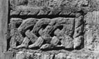 Stone 3b. A fragment from a much larger stone which preserves an undecorated angle within which the panel is decorated with interlace in low relief. The interlace forms a simple pattern E knot and has a double incised medial line.