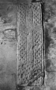 A (broad): The boundary of the cover is marked by a roll moulding but it is not known whether the other sides are decorated. Within the border, a cross with plain rectangular arms (type A1) is placed centrally. The cross, which is enhanced by a pair of incised lines around its edges, meets the border moulding at the sides but not at the top or base. The central cross is surrounded by five zones of interlace. The U-shaped area around the crosshead is filled with two zones, the interlace to the right extending only up the right-hand side whereas that on the left also extends across the top. The interlace itself, here as on the rest of the stone, is not very accurately executed; the strands are of domed section with little space in the interstices. Both interlace sequences are four-strand plaits – that to the left is enclosed, that to the right has two free ends. Below the cross-arm, the shaft is surrounded by three distinct zones of interlace. At the base the cross stands on a mound of interlace, but it is here that the stone is most abraded and only the interstices are still legible. The remaining pattern suggests that this was originally an enclosed grid. To either side of the cross-shaft are two runs of four-strand plait. That to the right also incorporates simple pattern F loops, but the sculptor's inventiveness outran his skill and one end is left untied behind the trefoil figure at the base of the pattern.