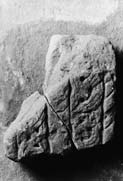 D (long): Stone 1b. This face (a fragment of the second flank panel) has been mostly broken away, but it is possible to identify a single knot of interlace with a double incised medial line. The motif represented might be type vii (Fig. 10). The arris between faces A and D is also cable-moulded.