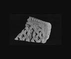 A (top): The border is defined by a single cable moulding and the central panel is occupied by the remains of two interconnecting lines of simple pattern F interlace, which produce a repetitive figure-of-eight pattern in one surviving row. The figure-of-eight units measure approximately 12.75 × 8.75 cm (5 × 3.5 in): the layout and spacing is competently regular. The decoration stands sharply as a squared U section against the flat cut-away background.