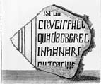 Inscription If Radford (1946, 95–6) was right to accept Turner's statement that the letters were approximately 4 inches high (10 cm), this would have been an unusually monumental inscription by surviving Anglo-Saxon standards. The 5–5.5 cm of the lettering of the Jarrow dedication inscription would be much more normal. It certainly seems to have been an impressive inscription with its moulded border (see below) and its ornamental lettering. As depicted in the engravings published in 1784 (Ill. 79) and 1789 (Ill. 80) the strokes of the letters are broad with little variation in thickness. [Note: The 1789 engraving is clearly based on that of 1784 and so is not an independent witness. Where the two differ, for example where the plate of 1789 comits the cross-bar of the first E in line 3 as shown in the earlier engraving, it is presumably less accurate.] They appear to have flared out gently towards the ends into trumpet-like terminations. Dr Radford has made the interesting suggestion (pers. comm.) that the Caistor inscription was in raised lettering or false relief. This was a laborious technique which was rare in Insular lettering but not unknown, as a handful of examples of the eighth and ninth centuries at Tarbat, Wensley and Bealin show (Higgitt 1982, 315–17). Against this it could be objected that finer strokes like the leg of the first R, if correctly shown, would be difficult to execute in relief and also that vulnerable relief lettering would probably have suffered greater damage given the condition of the stone. If the strokes were indeed incised and as broad as they appear to have been, the best Anglo-Saxon parallels might be the fragment of incised lettering from Winchester and the lost fragment from Shaftesbury (Okasha 1983, nos. 175, 183; Tweddle et al. 1995, 331–3). It looks as if the Winchester letters were designed for some kind of inlay. It is just possible that this was the case at Caistor.