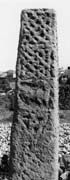 A (broad, west) : The edge moulding is plain and worn. The face has three rectangular panels separated by transverse plain mouldings. (i) The top panel contains worn closed circuit interlace (four stages of threefold circuits) in a fairly broad strand. The hole-points are drilled. (ii) The second panel is filled with closed circuit interlace (four stages of fourfold circuits). The hole-points are deeply cut and the crossings of the strands are rectangular. (iii) Below the transverse moulding, the third panel contains a very worn quadruped with a long neck and head bent backwards on the right of the panel (contra Collingwood 1911, fig. N.W.). The legs taper. (iv) Below the lower edge moulding of this panel is a pendant triquetra (Collingwood's drawing shows the triquetra linked to the moulding). (v) The lower portion of the shaft is undecorated.