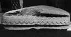 A (long) : On the bombé roof pitch is a six-petalled rosette within a sunken circle. Next to it is a long-stemmed cross or sword, lying horizontally. Below the eaves, the side has been drastically cut back to a flat plane. Along it is a strip of sixteen elliptical lozenges between narrow roll mouldings. The ellipses touch at their broadest points where the compass hole-points are visible, as well as a transverse axial line.