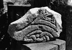 A (broad) : A plain flat edge moulding (2.5 cm wide) contains the centre and stub of one limb of a cross with a wide curving arm-pit. The arm has an internal flat moulding accommodated to the circular centre and its spandrels. Within it is a triangular damaged strand, median-incised, which may have been part of a fret pattern. The centre is encircled by a flat moulding, and within the ring are remains of disorganised loopwork in fleshy strand with a pellet filler.