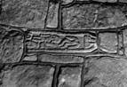 A (broad) : The top of the shaft narrows to form the neck of the cross. There is a broad modelled edge moulding. In the neck of the cross are the two feet of a Crucifixion, the toes turned outwards and standing on a broad transverse bar which is contained within the edge moulding. Within the long panel at the top of the shaft is a loosely disposed headless human body. Below it is a standing human in profile sucking his thumb. Below his elbow is a horizontal bar below which is a crudely cut anvil. Below his feet are remains of two loops.