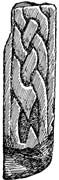 B (narrow) : Flanked by plain edge mouldings, the panel contains two registers of simple pattern F interlace, the terminal loop fashioned to a point within a glide. The pointed upper terminal of the loop below is all that survives. The strand is flat, 'chiselled rather neatly and the incised lines strengthened with hatching' (ibid., 291).