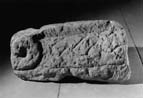 The end-beast is odd, and because of damage difficult to interpret. Collingwood'speculated that a small hole on one side might be a serpent's eye. However, the shape of the scar on top of the stone suggests a jowl.