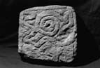 A (broad) : The edge moulding, which is modelled but very damaged, passes along the gently curved top of the stone. Within the panel a tightly coiled scroll in the centre terminates a loose strand which zig-zags below it and to each side. The broad strand is roughly hacked. The lower part is scabbled.