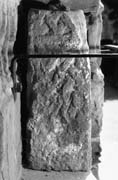 A (broad) : Largely defaced, but faint traces remain of a plain strap, above which is a transverse border, and above that an interlace terminal. The strands are 2.5 cm (1 in) wide.