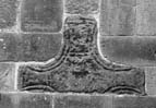 Cross type B9. The head is outlined by a neat double roll moulding, and there seems to have been a boss in the centre which is now obliterated. There is a transverse moulding across the upper arm, and above this there may have been some relief carving which is now scrabbled away. The arm tips have been trimmed to fit its present position.