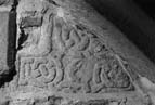 A (broad, interior) : There is a plain edge moulding. In the centre is a defaced boss (4 inches in diameter). The straight-sided cross-arms contain a looping strand whose knots are somewhat disorganised, two of them with bar terminals and an incorporated free ring. The broken arm had a different pattern.