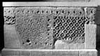 Only one face is visible. This is framed by a band of double-stranded triangular knots linked by angular twists (Allen 1903, 291, no. 748 A), enclosed in plain flat bands. The two internal panels are divided by a similar frame. What is now the left-hand panel has a deeply cut diaper pattern in which small relief crosses are enclosed in serrated diamond frames. The pattern on the right-hand panel is now almost obliterated, but earlier photographs (see Ill. 408 and Brown 1937, pl. XLVII) show a complex and rather confused pattern of interlocking and incised peltas.