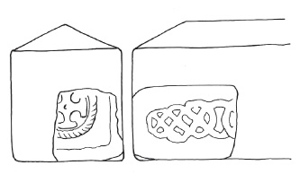 A (broad): One register of simple pattern F, narrower at its termination on the left, where the diagonals terminate by a simple butting against the inner face of the left-hand loop. The diagonals form a glide on the right to connect with another register of possibly the same pattern, of which the outer curve of the loop is present. The photograph and drawing (Collingwood 1915b, pl. I, 8 and fig. IVb on 289), and the re-drawing by McGuire and Clarke (1987, 30, fig. 39) imply some kind of border on the long edge above this pattern: but it cannot be an edge moulding as this would conflict with the upper edge of the panel on face D, which is clearly incomplete at the top, if the sides have been juxtaposed correctly in the drawings. Possibly the lower edge of another band of decoration?