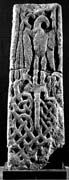 The interlace, though very worn, can be reconstructed to form a register of turned pattern F which divides on either side of the stem of the perch to become simply crossing strands through which loose rings are interlaced (closed-circuit pattern A). One crossing strand from each side joins at the top over the shaft, the outer strand on the left bends round to join the perch, the termination on the right-hand side is not clear.