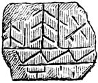 The decoration appears to be incised. All that survives on the main face is an outer frame carrying a meander pattern within which is an inner frame of zigzag ornament. Above this double border are four vertical incised lines linked by angled herringbone incisions. To the right is a further, isolated, angled line with shorter lines emerging at right angles from it.