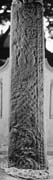 D (narrow, north): The right-hand vertical border, with its pellets, remains. At the top of the shaft is a panel of open four- or six-strand plait. The panels immediately below this are now heavily worn but, at the base, there are traces of knotwork involving encircled crossings.