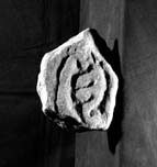 To the left are possible remains of a roll-moulding border. Flanking this is a scroll stem with, to the right, a form of half-moon leaf with curled terminal and two oval fruit or foliate forms.