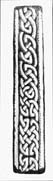 B (narrow): Continuous but changing interlace is enclosed in a broad roll moulding. At the top is a bold half pattern D, which skilfully changes below to a turned pattern D of a higher cord count.