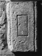 Only one face is visible. It is edged by a roll moulding. The face is raised and dressed smooth. The only decoration is a roughly incised rectangle.
