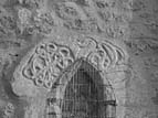 Panel with a semi-circular top, carved with two, seemingly unrelated motifs in shallow relief. Both motifs are cut by the pointed head of a thirteenth-century window. On the left side there is a slightly distorted, closed-circuit knot with double strands that cross at the centre and loop around the double encircling strands. To the right there is a strange, apparently headless, serpentine creature with what appears to be a two-toed foot at the top left and a tail that sweeps up across the body before splitting in two to end in two tight, downward-curving tips. Above this are disjointed loops that curve around a crescent-shape. It is possible that what is described above as the split tail should be seen as the creature's head, seen from above. In which case the two curving tips might be intended to represent the creature's eyes and the disjointed loops might be its tongue, with the foot-like appendage then becoming a forked tail.