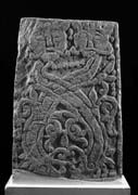 Grave-marker, broken a little at the base, with a pair of interlaced, double-ended creatures.