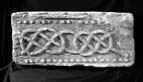 A (top): The upper face carries a plain narrow edge moulding and a continuous row of dome-headed pellets down each side. Within the pelleting is a loose-looped, closed-circuit, simple pattern F interlace (Cramp 1991, fig. 23). The strands are half-round in profile, and the pattern continues beyond the stone at one end. There is an in-turning side shoot with curling tip at this end, and there are traces of what is probably a second curling-tipped side shoot in one corner at the other end.