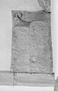 The panel is roughly rectangular and appears to be complete. It rests on a square sectioned string-course, the bottom of which is c. 6 m (c. 20 ft) above the present nave floor. The carving depicts a two-cell building, the right part being higher than the left. Both parts of the building have steeply sloping roofs, that on the left rising to an elaborate foliate finial. All other surfaces on this fictive building have been heavily cut-back. However, it is still possible to make out the remains of a pilaster, perhaps with a stepped base, on the left corner of the building, while on the right, one can trace the outline of two edging pilasters supporting a cut-back, round-headed arch.