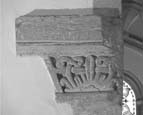 Trapezoidal capital with southern side cut back to a vertical edge. The capital is carved on western face with foliate decoration rising from a broad border and with a border running up the northern, sloping side. The carved face shows a central, fleshy vertical leaf flanked by small shoots and long curving shoots that become twisting tendrils near the top of the stone. A horizontal cross-bar divides the carved face into two zones. The capital is surmounted by a wide projecting abacus, square-faced with an inward chamfer on the lower face. A narrow V-shaped groove accentuates the top of the chamfered face. Both capital and abacus are through-stones.