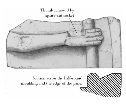The arm of the larger-than-life rood showing the socket that has removed the thumb, perhaps for repair or during later reuse (Bitton 2) (scale 1:10)