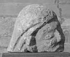 The head from a figure carving, rather smaller in scale than Bitton 1 and 2. The head is flat at the base, but otherwise carved in the round. The back of the head is roughly cut back. There is part of a small, circular, flat-bottomed recess on the top of the head, and two 'sawn' lines at right angles to each other radiate from this recess. This is probably the remains of the top fixing-socket for the figure. Alternatively it might be the seating for an added embellishment in metal — perhaps a halo, or the result of a later reuse of the original carving. The figure is looking to the left and wears a cloak or veil similar to the Virgin from Breedon-on-the-Hill, Leicestershire (Cramp 1977, 215, fig. 58). Faint inscribed lines curve across the surface of the cloak. The features are strong: the lips are full, the nose is broad and the eyes are bulbous. A comma-shaped feature on the right side of the head may be a lock of hair or the right ear.